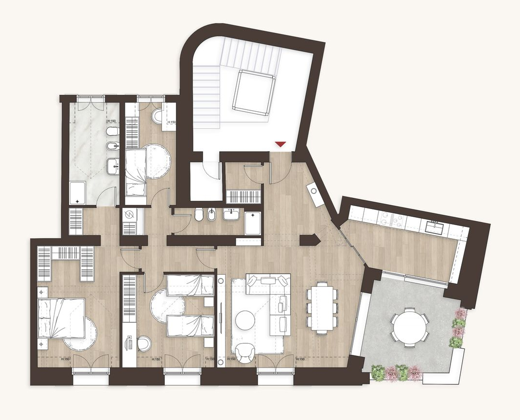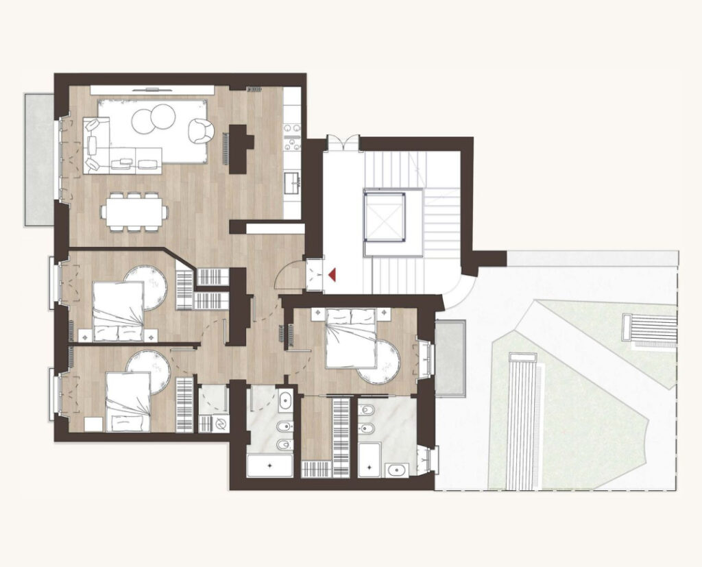 Bilocali, trilocali, quadrilocali e attici: le soluzioni disponibili variano dai tagli funzionali ai grandi spazi. Ambienti ampi, luminosi e silenziosi si affacciano sulla suggestiva cornice della piazza.